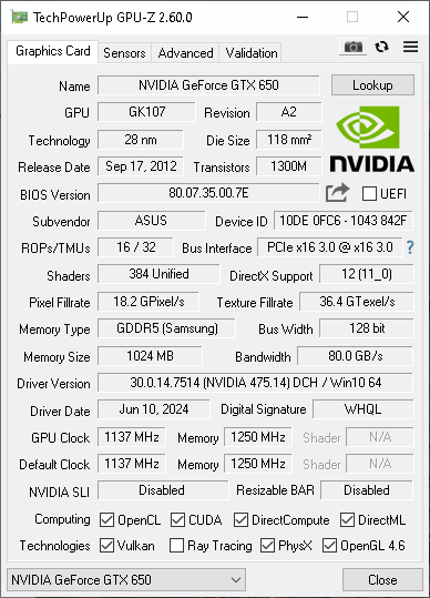 GeForce GTX 650 GPUZ